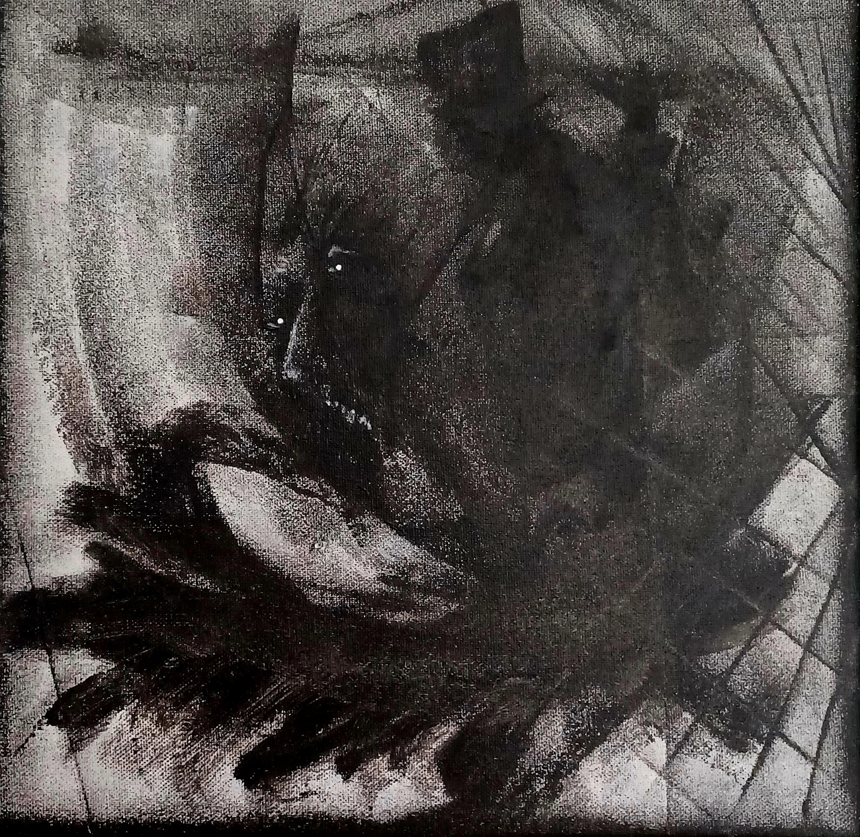 Toile réalisée à la suite de « derrière la fenêtre », sans idée préconçue, mais légèrement travaillée dans un 2ème temps (chapeau haut de forme et pupilles)