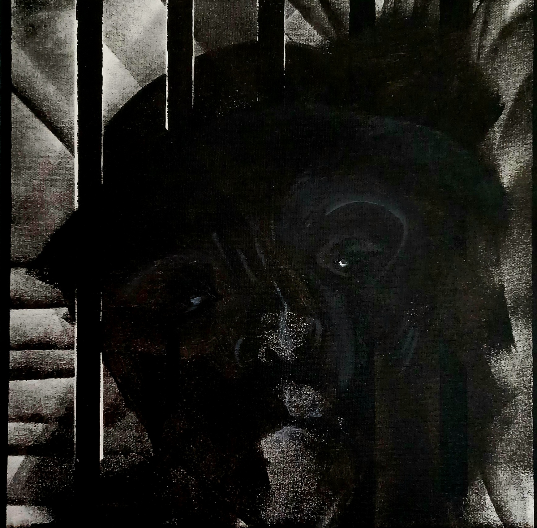 Toile réalisée à la suite de « derrière la fenêtre », avec l’idée d’un portrait et de barreaux. Retravaillée dans un 2ème temps