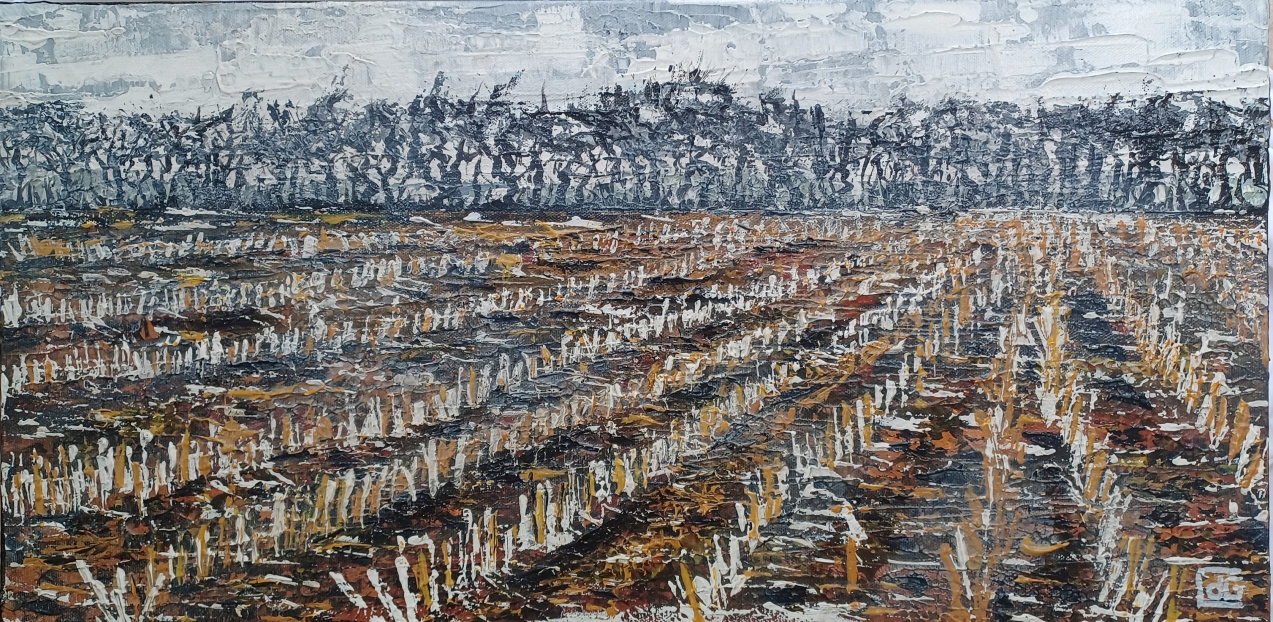 Cette toile prolonge une série dédiée à la terre, à l’oubli, à la mémoire d’un monde qui résiste à sa propre disparition.