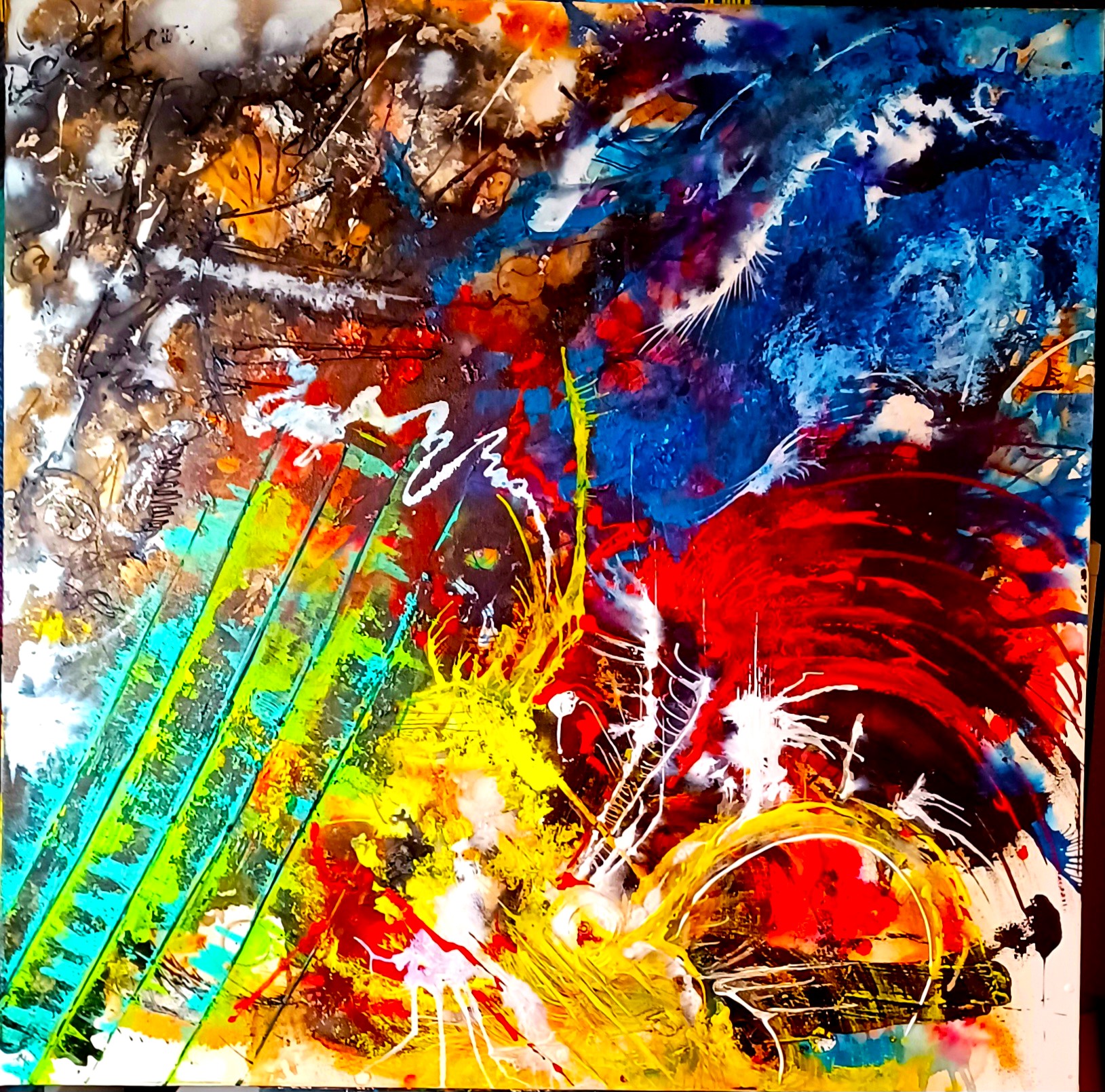 Chaos s’impose comme une œuvre charnière avant la production de l’automne 2024. La surface, travaillée sur un gesso épais, accueille un affrontement de couleurs vives et saturées : le rouge, le bleu, le jaune et le vert se heurtent, s’entrechoquent sans hiérarchie, tantôt reflet d’émotions, tantôt évocation des éléments primordiaux. Les couleurs se superposent et s’éclatent en éclaboussures et jaillissements. L’usage de l’acrylique, mêlée aux encres soufflées, accentue la sensation de mouvement désordonné et d’énergie incontrôlable.