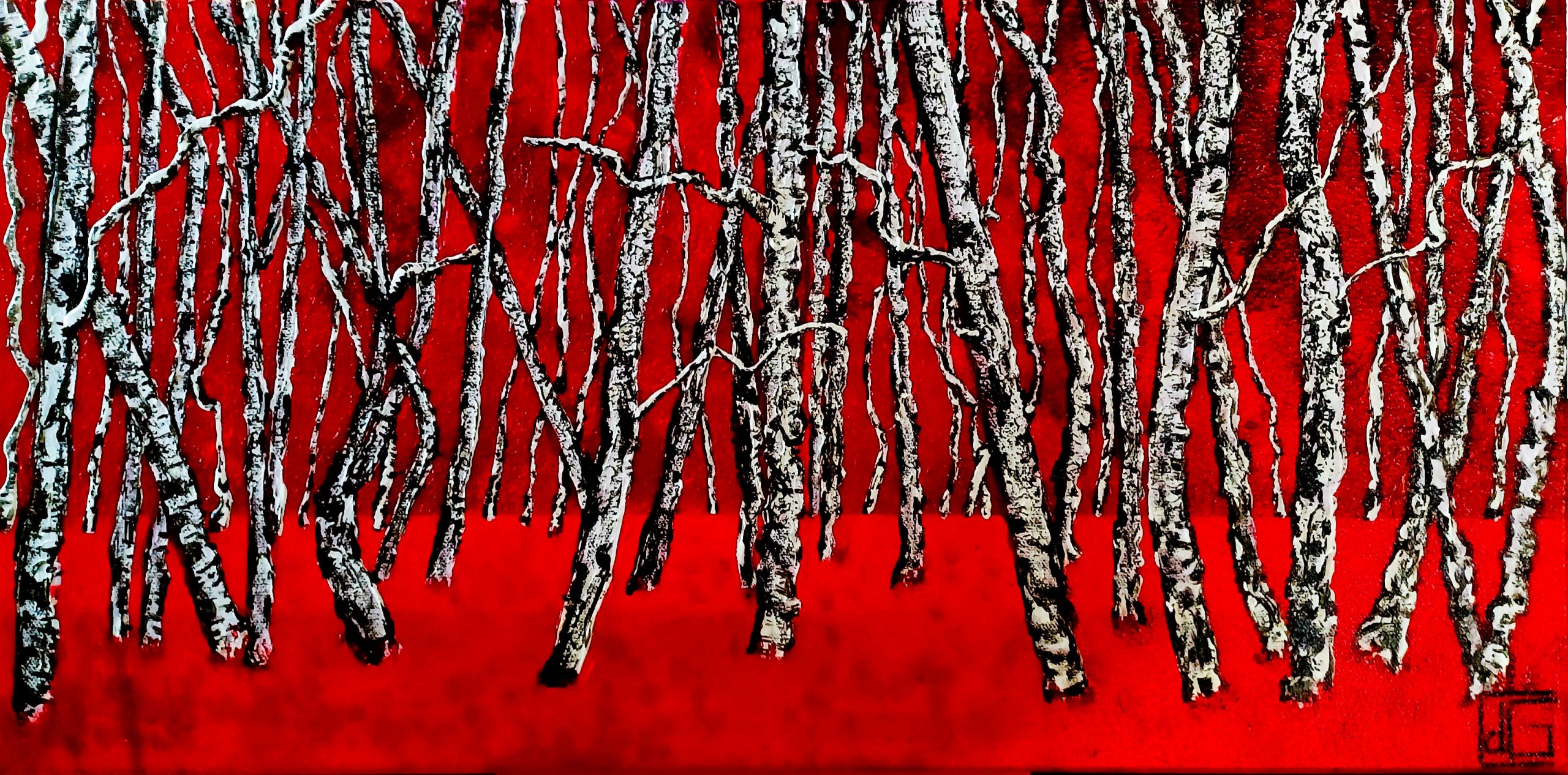 En écho à la chanson culte de David Bowie, cette toile déploie un paysage rouge fragmenté, traversé de silhouettes de bouleaux. Ces arbres, que Bowie affectionnait particulièrement, évoquent ici les multiples personnages qu’il a incarnés au fil du temps — autant de métamorphoses, de peaux successives.